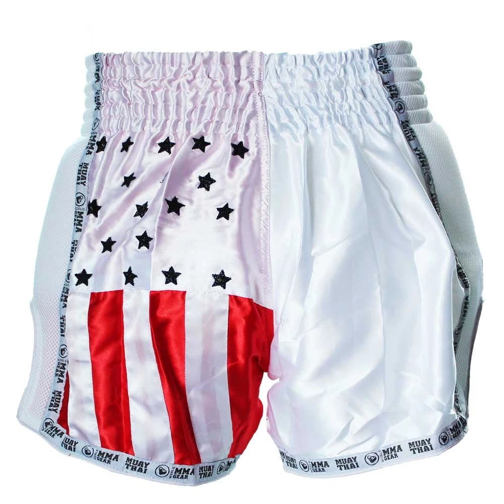 PREMIUM MUAY THAI SHORTS MEN WOMEN USA FLAG BY WORLD MMA GEAR – WHITE
